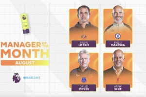 体育资讯9月4日讯 英超官方公布8月最佳教练候选。桑德兰主帅布里斯、切尔西主帅马雷斯卡、埃弗顿主帅莫耶斯以及利物浦主帅斯洛特入围。