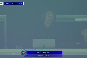 比赛第23分钟,转播镜头给到巴黎主帅恩里克,他出现在看台上,头戴耳机指挥着球队。