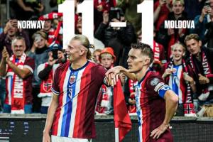 体育资讯09月20日讯 世预赛欧洲区I组第6轮,摩尔多瓦队1-11惨败挪威队,哈兰德5球2助。