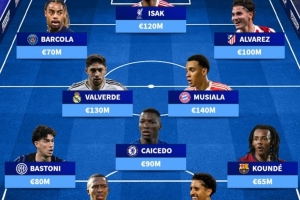 前锋:巴尔科拉(巴黎 7000万欧)、伊萨克(纽卡、利物浦 1.2亿欧)、阿尔瓦雷斯(马竞 1亿欧)
