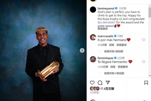 体育资讯9月23日讯 亚马尔更新社媒动态,庆祝获得科帕奖,并祝贺登贝莱斩获金球奖。