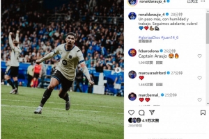 阿劳霍社媒晒照庆祝取胜,他写道:“又迈出一步,怀着谦逊与努力。我们继续前进,巴萨球迷们!”