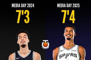美媒从名单上发现,21岁的文班亚马长高了1英寸,去年媒体日时他的身高是7英尺3英寸(约2米21),现在是7英尺4英寸(约2米24)。