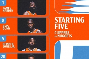 和上场一致!快船vs掘金首发:哈登/邓恩/小琼斯/科林斯/祖巴茨