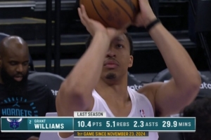 黄蜂VS爵士,转播方晒图,黄蜂球员格兰特-威廉姆斯今天复出上演赛季首秀。