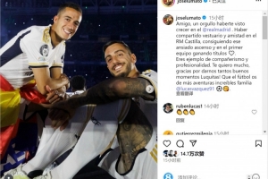 何塞卢社媒晒出与巴斯克斯在皇马的合照,并写道:“朋友,我很自豪见证你在皇马成长,我们在卡斯蒂亚共用更衣室、建立友谊,最终实现了升上一线队的梦想,并在一线队一起赢得冠军。